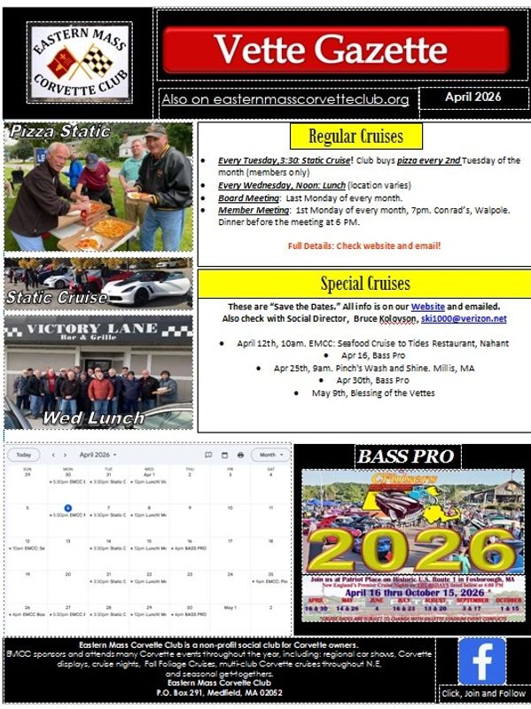The EMCC Vette Gazette is our monthly publication filled with that month's cruises, photos, events, news and much more!
